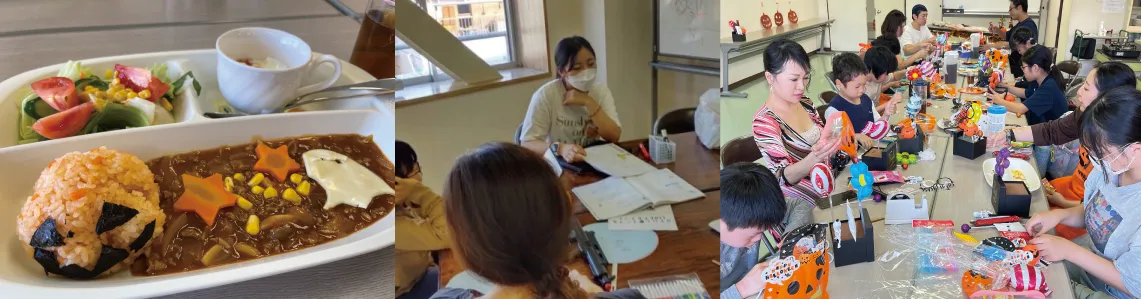 季節の食材を使ったご飯を食べた後は、お家では出来ない遊びや製作など。現役大学生による学習支援、親御向け子育て相談室を別室にて設けています。